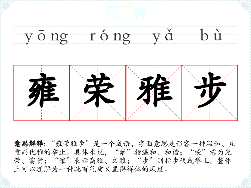 “雍荣雅步”是一个成语,字面意思是形容一种温和、庄重而优雅的举止。具体来说,“雍”指温和、和谐;“荣”意为光荣、富贵;“雅”表示高雅、文雅;“步”则指步伐或举止。整体上可以理解为一种既有气质又显得得体的风度。