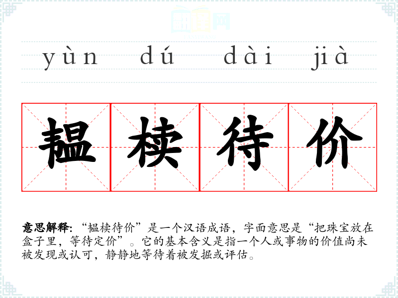 “韫椟待价”是一个汉语成语,字面意思是“把珠宝放在盒子里,等待定价”。它的基本含义是指一个人或事物的价值尚未被发现或认可,静静地等待着被发掘或评估。
