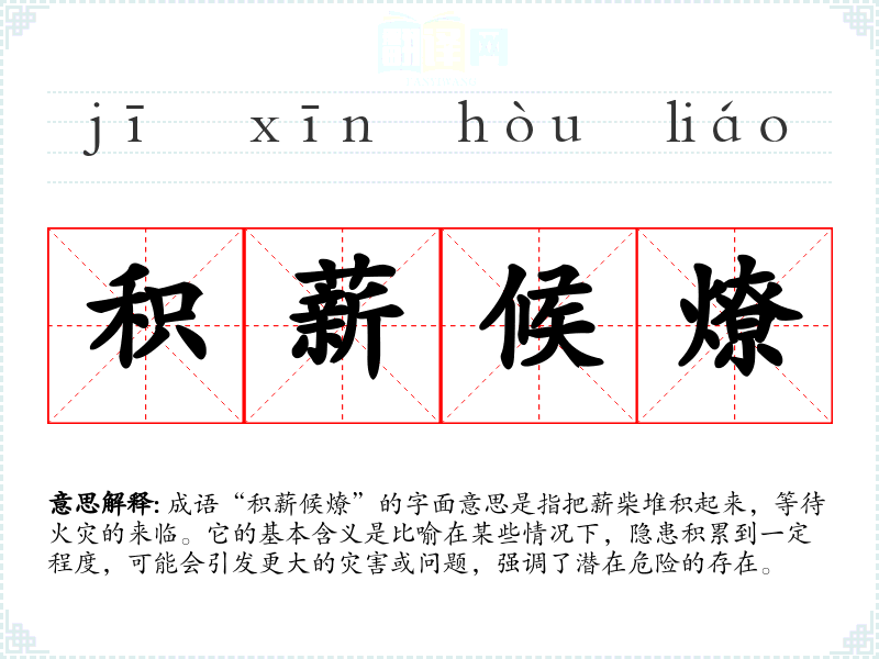 成语“积薪候燎”的字面意思是指把薪柴堆积起来,等待火灾的来临。它的基本含义是比喻在某些情况下,隐患积累到一定程度,可能会引发更大的灾害或问题,强调了潜在危险的存在。