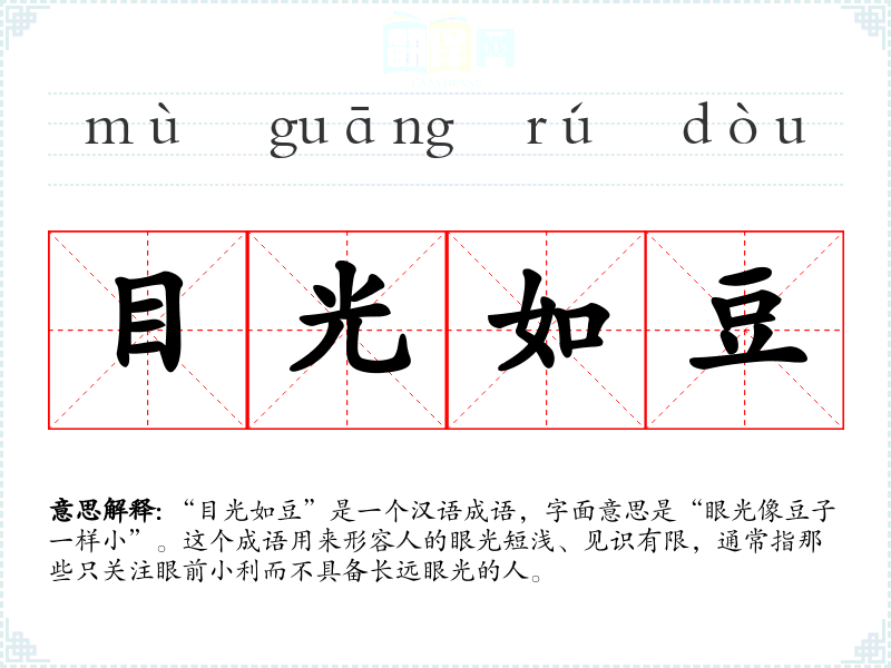 “目光如豆”是一个汉语成语,字面意思是“眼光像豆子一样小”。这个成语用来形容人的眼光短浅、见识有限,通常指那些只关注眼前小利而不具备长远眼光的人。
