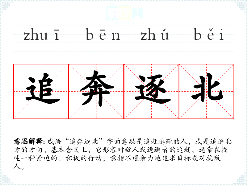 成语“追奔逐北”字面意思是追赶逃跑的人,或是追逐北方的方向。基本含义上,它形容对敌人或逃避者的追赶,通常在描述一种紧迫的、积极的行动,意指不遗余力地追求目标或对抗敌人。
