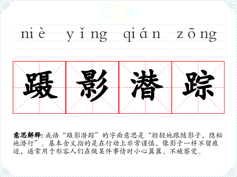 成语“蹑影潜踪”的字面意思是“轻轻地跟随影子,隐秘地潜行”。基本含义指的是在行动上非常谨慎,像影子一样不留痕迹,通常用于形容人们在做某件事情时小心翼翼、不被察觉。