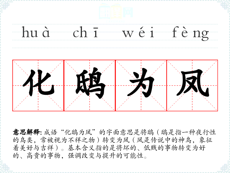 成语“化鸱为凤”的字面意思是将鸱(鸱是指一种夜行性的鸟类,常被视为不祥之物)转变为凤(凤是传说中的神鸟,象征着美好与吉祥)。基本含义指的是将坏的、低贱的事物转变为好的、高贵的事物,强调改变与提升的可能性。
