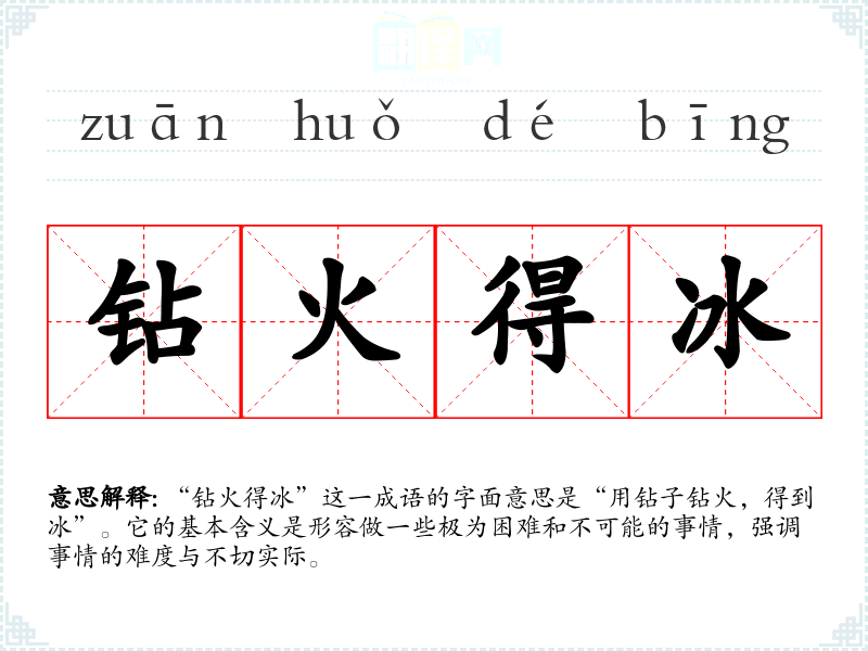 “钻火得冰”这一成语的字面意思是“用钻子钻火,得到冰”。它的基本含义是形容做一些极为困难和不可能的事情,强调事情的难度与不切实际。