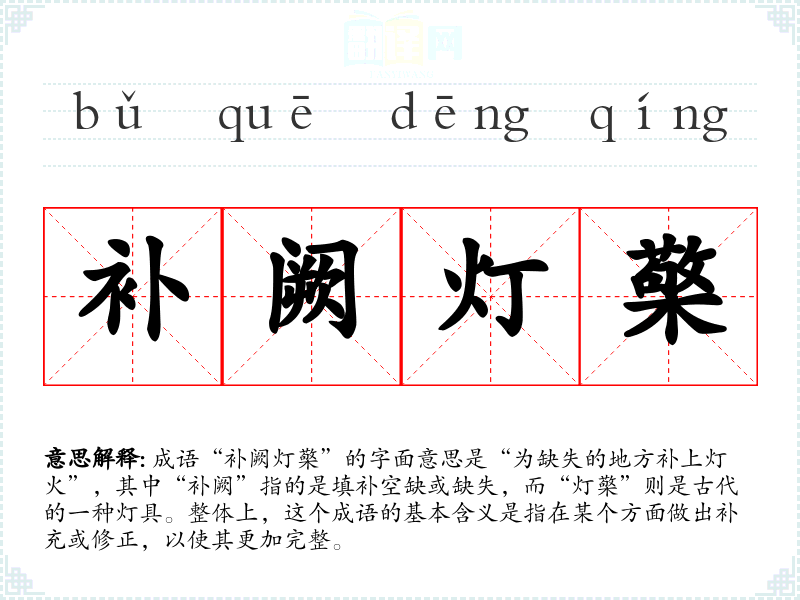 成语“补阙灯檠”的字面意思是“为缺失的地方补上灯火”,其中“补阙”指的是填补空缺或缺失,而“灯檠”则是古代的一种灯具。整体上,这个成语的基本含义是指在某个方面做出补充或修正,以使其更加完整。