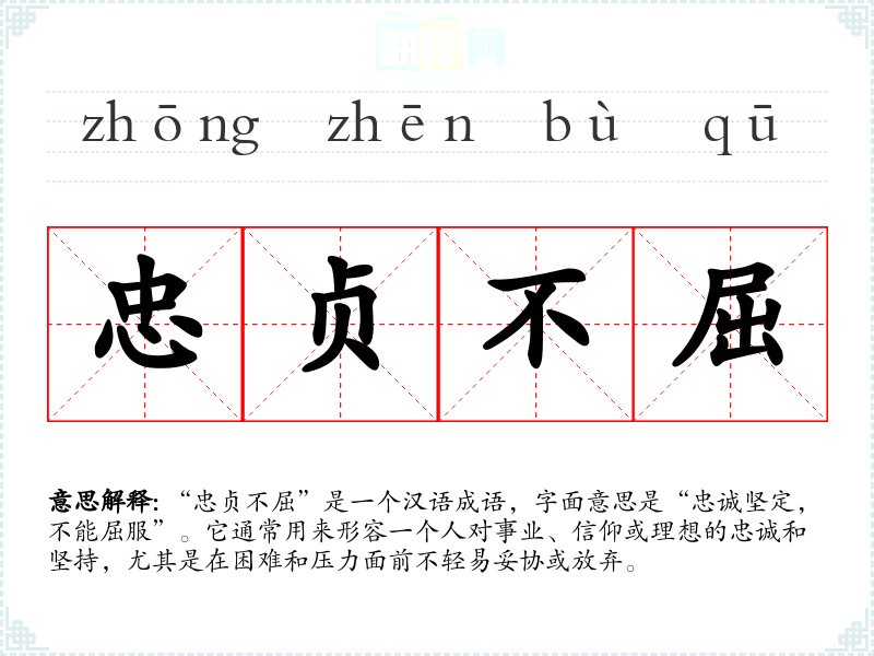 “忠贞不屈”是一个汉语成语,字面意思是“忠诚坚定,不能屈服”。它通常用来形容一个人对事业、信仰或理想的忠诚和坚持,尤其是在困难和压力面前不轻易妥协或放弃。
