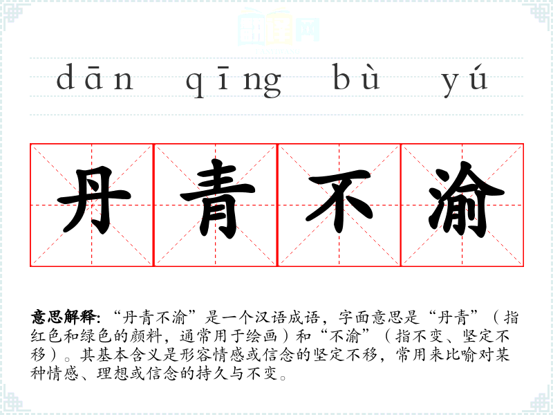 “丹青不渝”是一个汉语成语,字面意思是“丹青”(指红色和绿色的颜料,通常用于绘画)和“不渝”(指不变、坚定不移)。其基本含义是形容情感或信念的坚定不移,常用来比喻对某种情感、理想或信念的持久与不变。