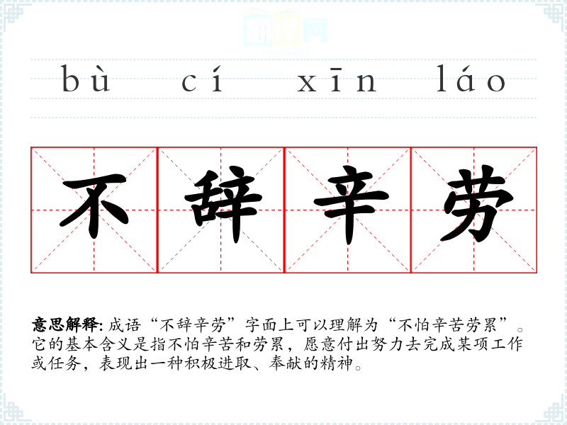 | 不辞辛苦 | 辞:推辞。虽然劳累和辛苦也不推辞,形容工作勤奋努力 |