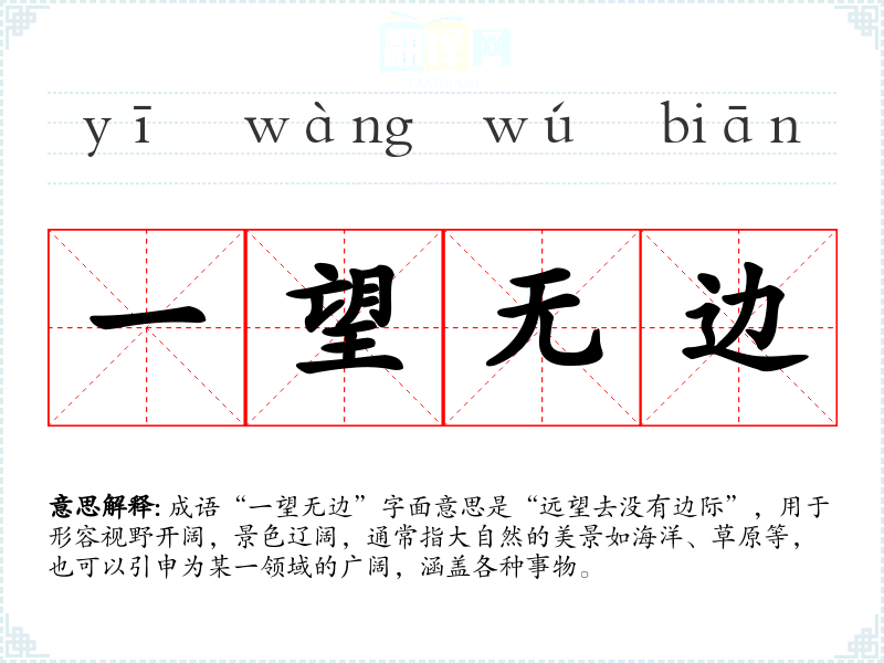 成语“一望无边”字面意思是“远望去没有边际”,用于形容视野开阔,景色辽阔,通常指大自然的美景如海洋、草原等,也可以引申为某一领域的广阔,涵盖各种事物。