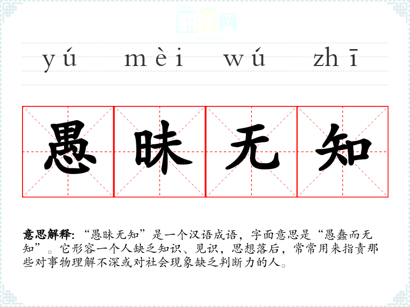 “愚昧无知”是一个汉语成语,字面意思是“愚蠢而无知”。它形容一个人缺乏知识、见识,思想落后,常常用来指责那些对事物理解不深或对社会现象缺乏判断力的人。