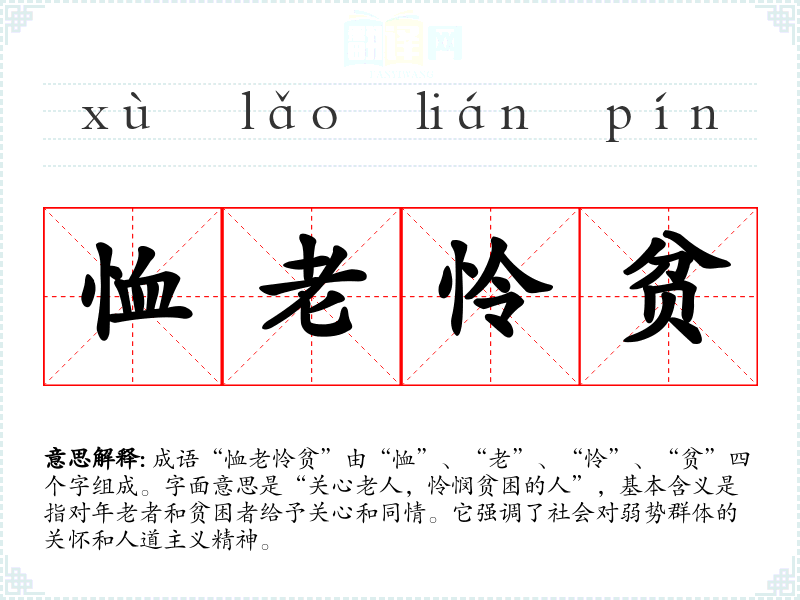 成语“恤老怜贫”由“恤”、“老”、“怜”、“贫”四个字组成。字面意思是“关心老人,怜悯贫困的人”,基本含义是指对年老者和贫困者给予关心和同情。它强调了社会对弱势群体的关怀和人道主义精神。
