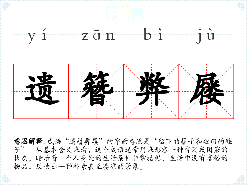 成语“遗簪弊屦”的字面意思是“留下的簪子和破旧的鞋子”。从基本含义来看,这个成语通常用来形容一种贫困或困窘的状态,暗示着一个人身处的生活条件非常拮据,生活中没有富裕的物品,反映出一种朴素甚至凄凉的景象。