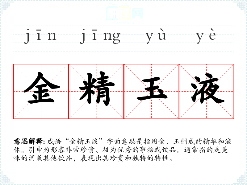 成语“金精玉液”字面意思是指用金、玉制成的精华和液体。引申为形容非常珍贵、极为优秀的事物或饮品。通常指的是美味的酒或其他饮品,表现出其珍贵和独特的特性。
