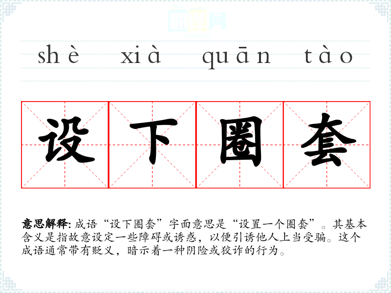 成语“设下圈套”字面意思是“设置一个圈套”。其基本含义是指故意设定一些障碍或诱惑,以便引诱他人上当受骗。这个成语通常带有贬义,暗示着一种阴险或狡诈的行为。