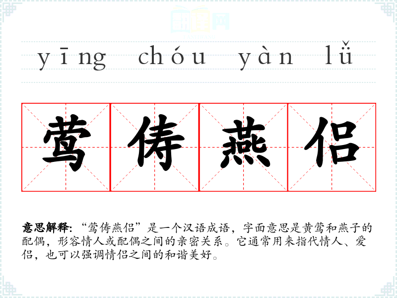“莺俦燕侣”是一个汉语成语,字面意思是黄莺和燕子的配偶,形容情人或配偶之间的亲密关系。它通常用来指代情人、爱侣,也可以强调情侣之间的和谐美好。