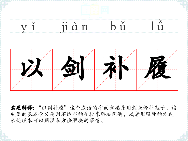 | 以剑补履 | 用宝剑来补鞋子。指所用的方法、措施无法解决问题。比喻运用不当。 |
