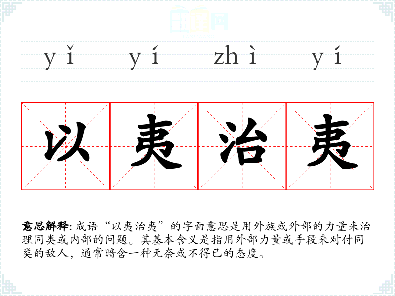 成语“以夷治夷”的字面意思是用外族或外部的力量来治理同类或内部的问题。其基本含义是指用外部力量或手段来对付同类的敌人,通常暗含一种无奈或不得已的态度。