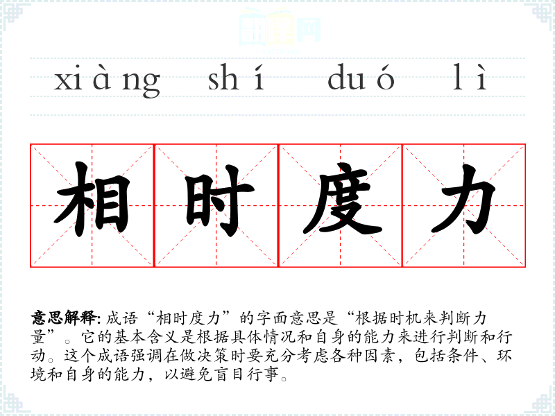 成语“相时度力”的字面意思是“根据时机来判断力量”。它的基本含义是根据具体情况和自身的能力来进行判断和行动。这个成语强调在做决策时要充分考虑各种因素,包括条件、环境和自身的能力,以避免盲目行事。