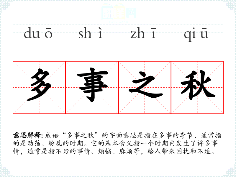 成语“多事之秋”的字面意思是指在多事的季节,通常指的是动荡、纷乱的时期。它的基本含义指一个时期内发生了许多事情,通常是指不好的事情、烦恼、麻烦等,给人带来困扰和不适。