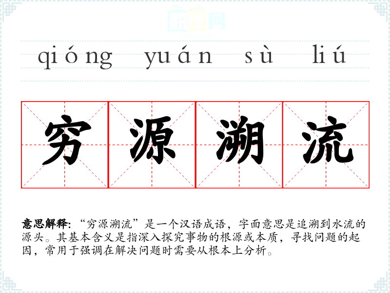 “穷源溯流”是一个汉语成语,字面意思是追溯到水流的源头。其基本含义是指深入探究事物的根源或本质,寻找问题的起因,常用于强调在解决问题时需要从根本上分析。