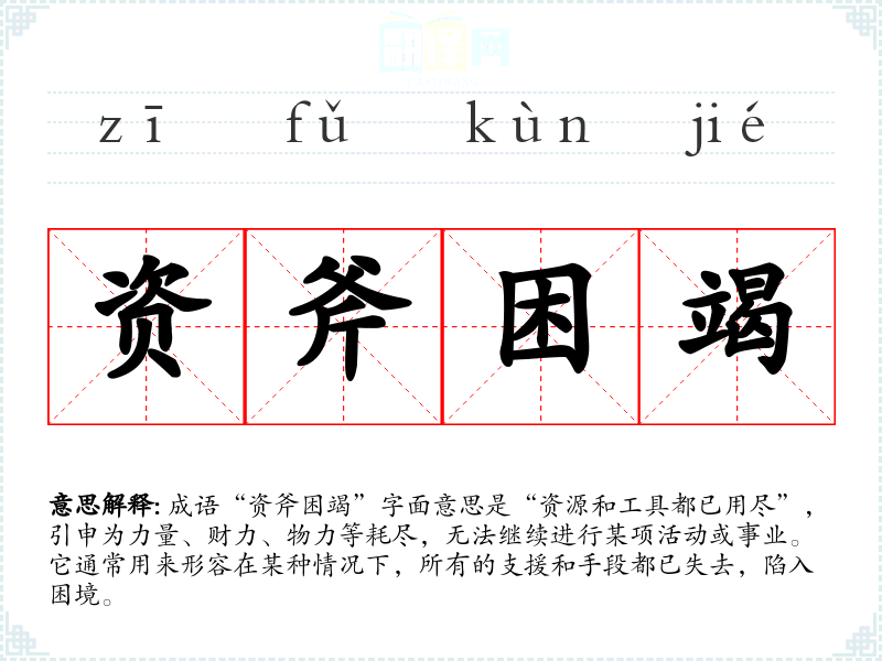 成语“资斧困竭”字面意思是“资源和工具都已用尽”,引申为力量、财力、物力等耗尽,无法继续进行某项活动或事业。它通常用来形容在某种情况下,所有的支援和手段都已失去,陷入困境。
