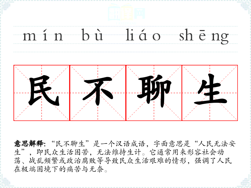 在英语中,“the people are suffering”或“the common people are in distress”可以表达类似的意思,但却没有一个与“民不聊生”完全对应的成语。不同文化中对民众苦难的表达方式也反映出各自社会历史背景的差异。