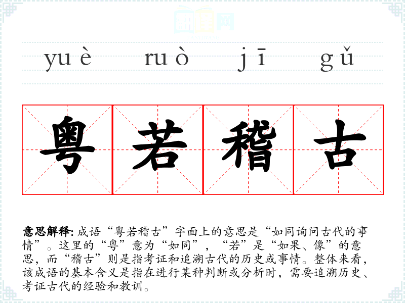 成语“粤若稽古”字面上的意思是“如同询问古代的事情”。这里的“粤”意为“如同”,“若”是“如果、像”的意思,而“稽古”则是指考证和追溯古代的历史或事情。整体来看,该成语的基本含义是指在进行某种判断或分析时,需要追溯历史、考证古代的经验和教训。