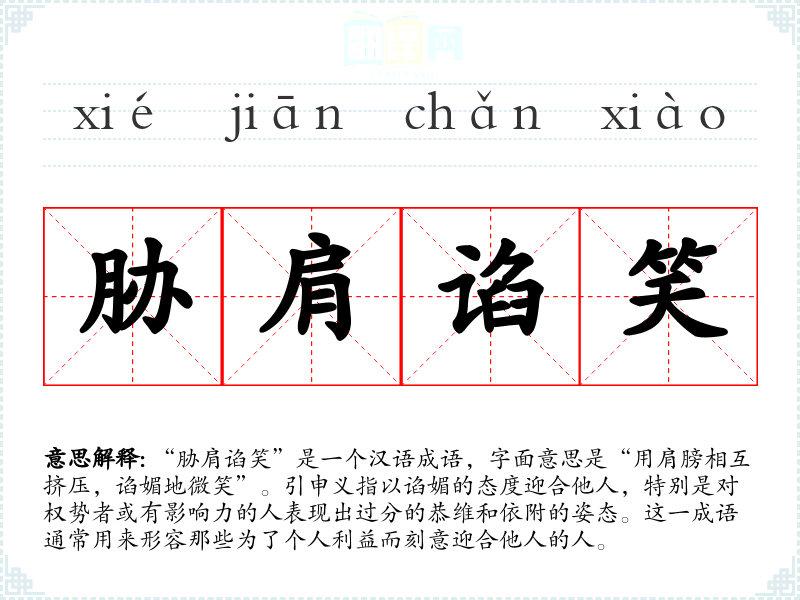 “胁肩谄笑”是一个汉语成语,字面意思是“用肩膀相互挤压,谄媚地微笑”。引申义指以谄媚的态度迎合他人,特别是对权势者或有影响力的人表现出过分的恭维和依附的姿态。这一成语通常用来形容那些为了个人利益而刻意迎合他人的人。