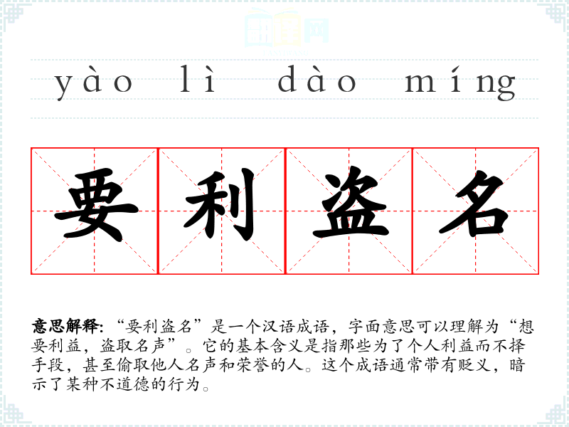 “要利盗名”是一个汉语成语,字面意思可以理解为“想要利益,盗取名声”。它的基本含义是指那些为了个人利益而不择手段,甚至偷取他人名声和荣誉的人。这个成语通常带有贬义,暗示了某种不道德的行为。