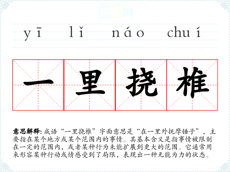 成语“一里挠椎”字面意思是“在一里外抚摩锤子”,主要指在某个地方或某个范围内的事情。其基本含义是指事情被限制在一定的范围内,或者某种行为未能扩展到更大的范围。它通常用来形容某种行动或情感受到了局限,表现出一种无能为力的状态。