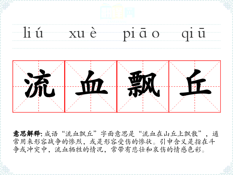 成语“流血飘丘”字面意思是“流血在山丘上飘散”,通常用来形容战争的惨烈,或是形容受伤的惨状。引申含义是指在斗争或冲突中,流血牺牲的情况,常带有悲壮和哀伤的情感色彩。