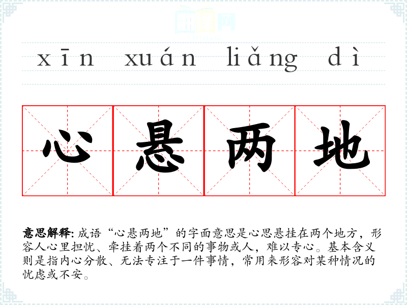成语“心悬两地”的字面意思是心思悬挂在两个地方,形容人心里担忧、牵挂着两个不同的事物或人,难以专心。基本含义则是指内心分散、无法专注于一件事情,常用来形容对某种情况的忧虑或不安。
