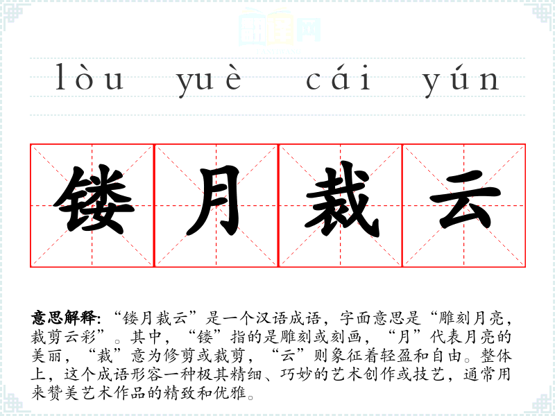 “镂月裁云”是一个汉语成语,字面意思是“雕刻月亮,裁剪云彩”。其中,“镂”指的是雕刻或刻画,“月”代表月亮的美丽,“裁”意为修剪或裁剪,“云”则象征着轻盈和自由。整体上,这个成语形容一种极其精细、巧妙的艺术创作或技艺,通常用来赞美艺术作品的精致和优雅。