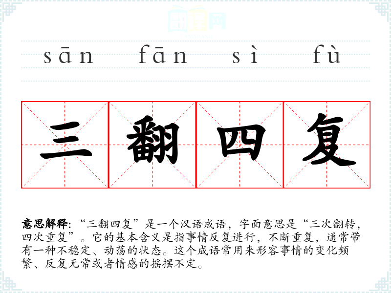 “三翻四复”是一个汉语成语,字面意思是“三次翻转,四次重复”。它的基本含义是指事情反复进行,不断重复,通常带有一种不稳定、动荡的状态。这个成语常用来形容事情的变化频繁、反复无常或者情感的摇摆不定。