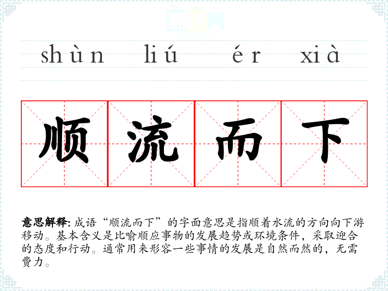 - 演讲:在演讲中,可以用此成语强调适应形势的重要性,如“在快速变化的时代,我们要学会顺流而下,以求发展”。