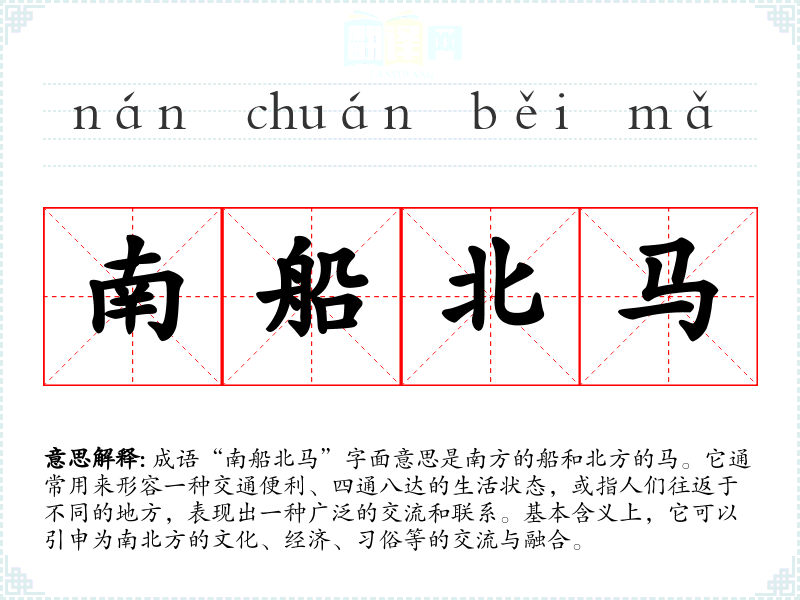 成语“南船北马”字面意思是南方的船和北方的马。它通常用来形容一种交通便利、四通八达的生活状态,或指人们往返于不同的地方,表现出一种广泛的交流和联系。基本含义上,它可以引申为南北方的文化、经济、*俗等的交流与融合。