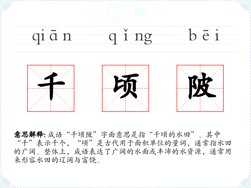 成语“千顷陂”字面意思是指“千顷的水田”。其中“千”表示千个,“顷”是古代用于面积单位的量词,通常指水田的广阔。整体上,成语表达了广阔的水面或丰沛的水资源,通常用来形容水田的辽阔与富饶。