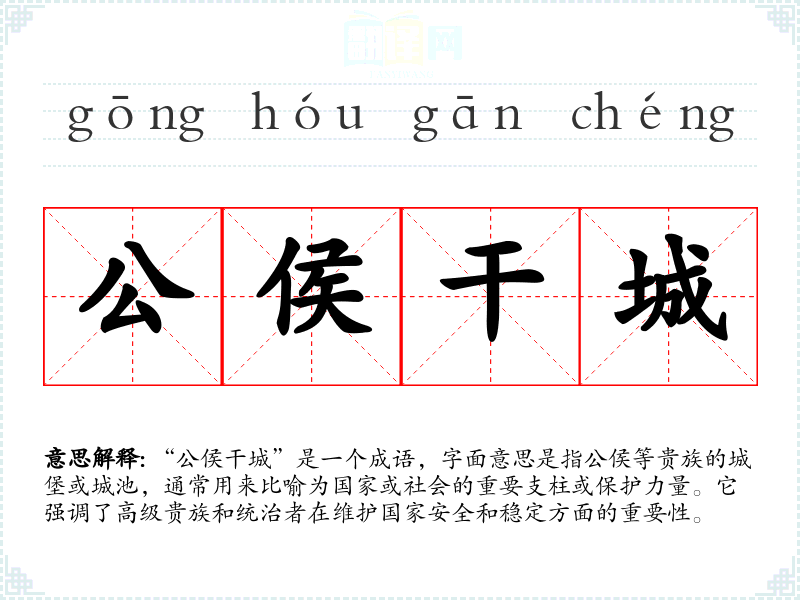 “公侯干城”是一个成语,字面意思是指公侯等贵族的城堡或城池,通常用来比喻为国家或社会的重要支柱或保护力量。它强调了高级贵族和统治者在维护国家安全和稳定方面的重要性。