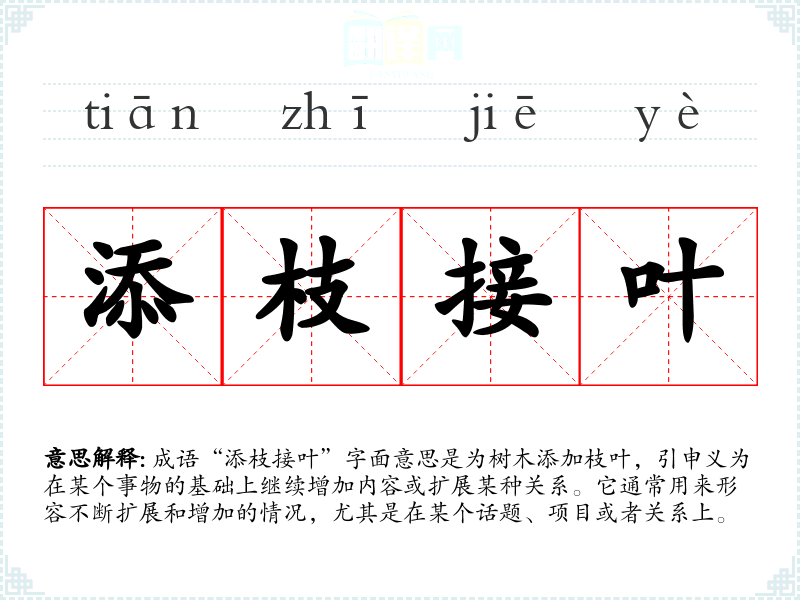 成语“添枝接叶”字面意思是为树木添加枝叶,引申义为在某个事物的基础上继续增加内容或扩展某种关系。它通常用来形容不断扩展和增加的情况,尤其是在某个话题、项目或者关系上。
