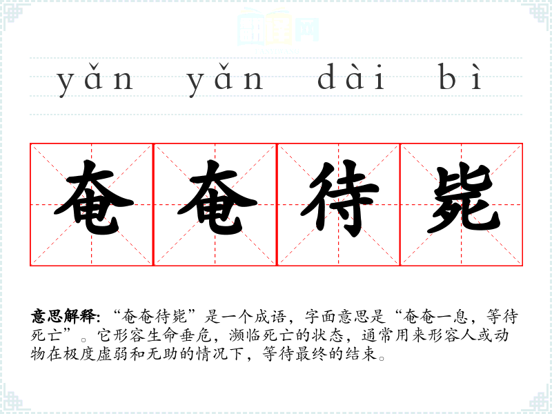| 奄奄一息 | 奄奄:呼吸微弱的样子。只剩下一口气。形容临近死亡。 |