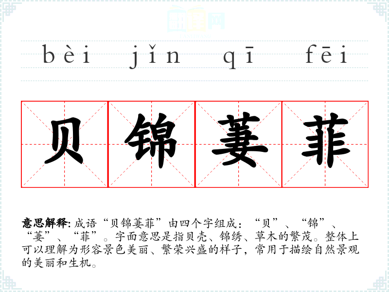 成语“贝锦萋菲”由四个字组成:“贝”、“锦”、“萋”、“菲”。字面意思是指贝壳、锦绣、草木的繁茂。整体上可以理解为形容景色美丽、繁荣兴盛的样子,常用于描绘自然景观的美丽和生机。