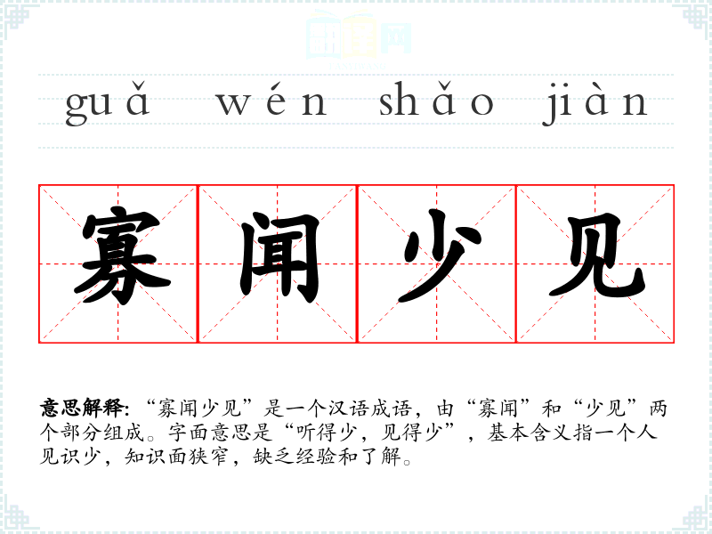 “寡闻少见”是一个汉语成语,由“寡闻”和“少见”两个部分组成。字面意思是“听得少,见得少”,基本含义指一个人见识少,知识面狭窄,缺乏经验和了解。