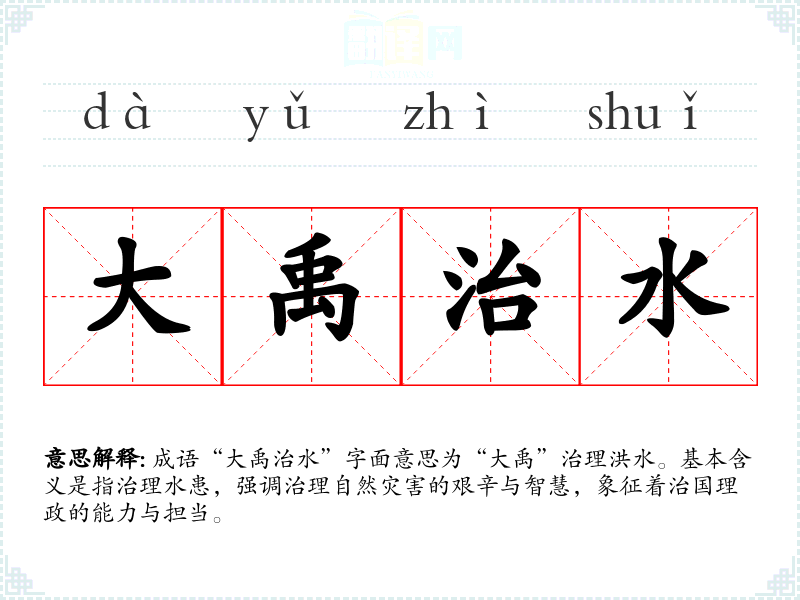 成语“大禹治水”字面意思为“大禹”治理洪水。基本含义是指治理水患,强调治理自然灾害的艰辛与智慧,象征着治国理政的能力与担当。