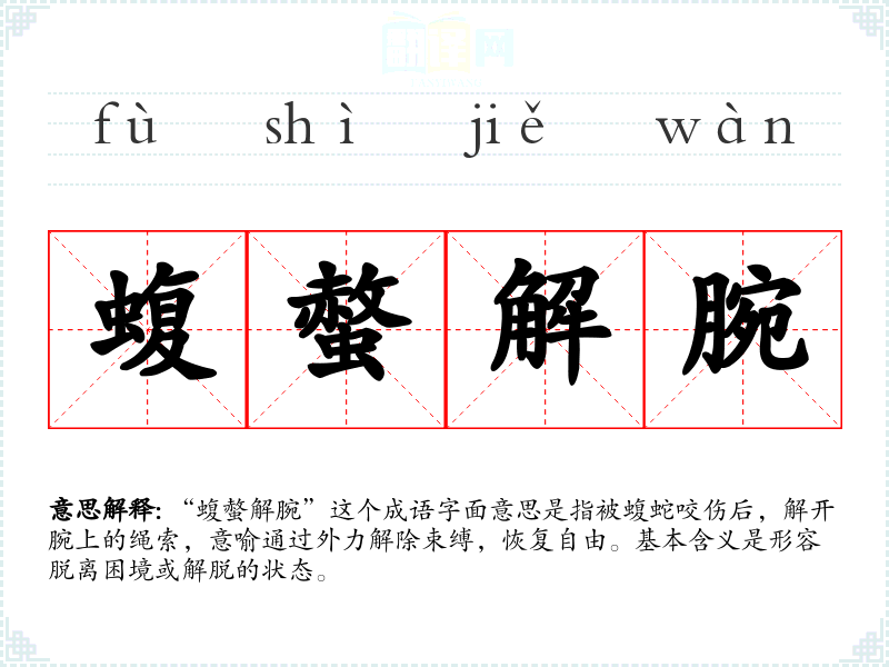 “蝮螫解腕”这个成语字面意思是指被蝮蛇咬伤后,解开腕上的绳索,意喻通过外力解除束缚,恢复自由。基本含义是形容脱离困境或解脱的状态。