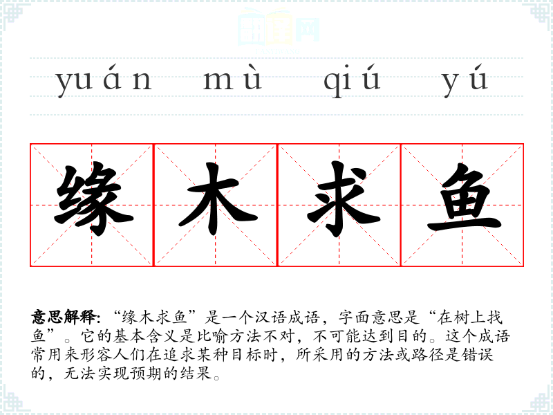 “缘木求鱼”是一个汉语成语,字面意思是“在树上找鱼”。它的基本含义是比喻方法不对,不可能达到目的。这个成语常用来形容人们在追求某种目标时,所采用的方法或路径是错误的,无法实现预期的结果。