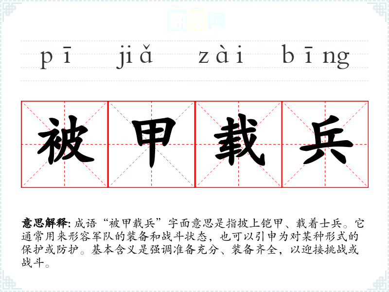 成语“被甲载兵”字面意思是指披上铠甲、载着士兵。它通常用来形容军队的装备和战斗状态,也可以引申为对某种形式的保护或防护。基本含义是强调准备充分、装备齐全,以迎接挑战或战斗。