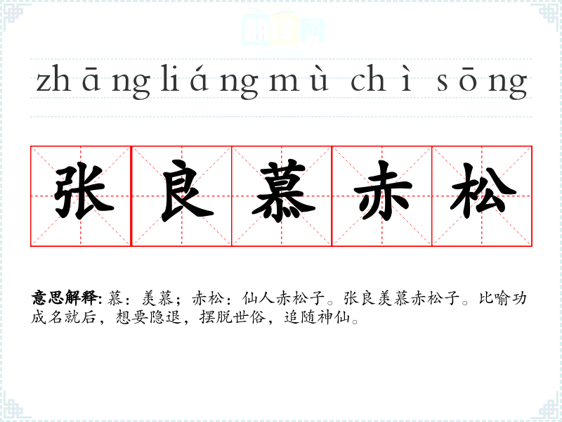 慕:羡慕;赤松:仙人赤松子。张良羡慕赤松子。比喻功成名就后,想要隐退,摆脱世俗,追随神仙。 |