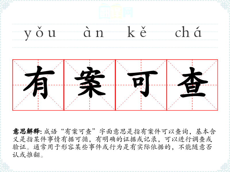 成语“有案可查”字面意思是指有案件可以查询,基本含义是指某件事情有据可循,有明确的证据或记录,可以进行调查或验证。通常用于形容某些**或行为是有实际依据的,不能随意否认或推翻。