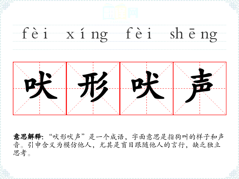 “吠形吠声”是一个成语,字面意思是指狗叫的样子和声音。引申含义为模仿他人,尤其是盲目跟随他人的言行,缺乏独立思考。