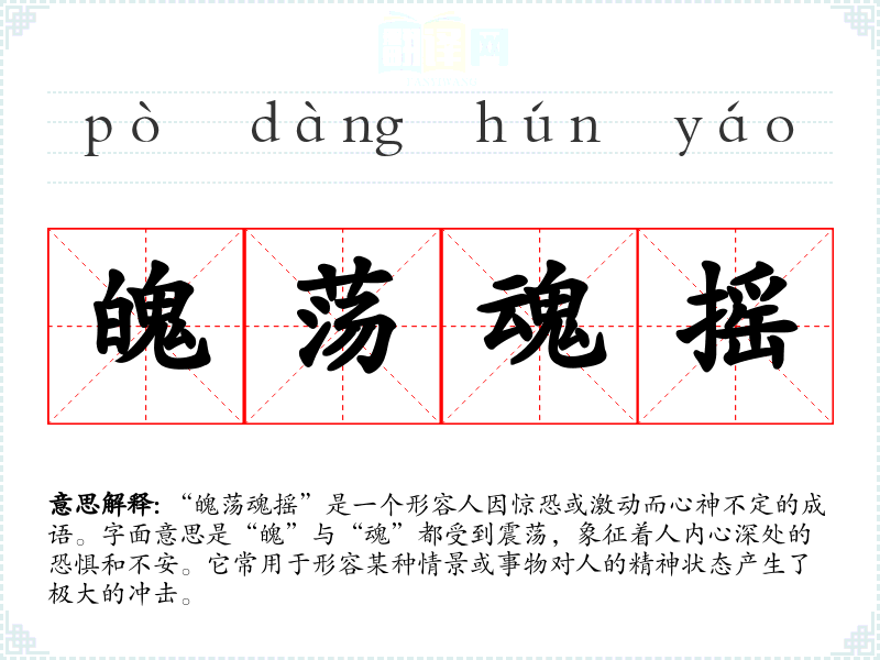 “魄荡魂摇”是一个形容人因惊恐或激动而心神不定的成语。字面意思是“魄”与“魂”都受到震荡,象征着人内心深处的恐惧和不安。它常用于形容某种情景或事物对人的精神状态产生了极大的冲击。